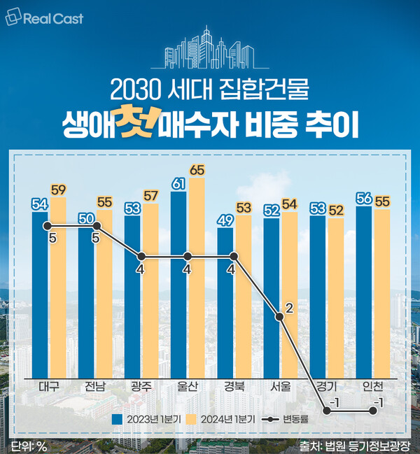 지역별로는 지방에서의 강세가 돋보였는데요. 특히 대구와 전라남도의 경우, 올해 1분기 집합건물 생애 첫 매수자 중 2030 세대 비율이 지난해 같은 기간과 비교해 약 5% 증가한 것으로 나타났습니다. 그다음으로는 광주·울산·경북이 약 4%씩 늘었으며, 수도권은 서울이 약 2%, 인천·경기는 약 -1%씩 감소하는 등 약세를 나타냈습니다.
