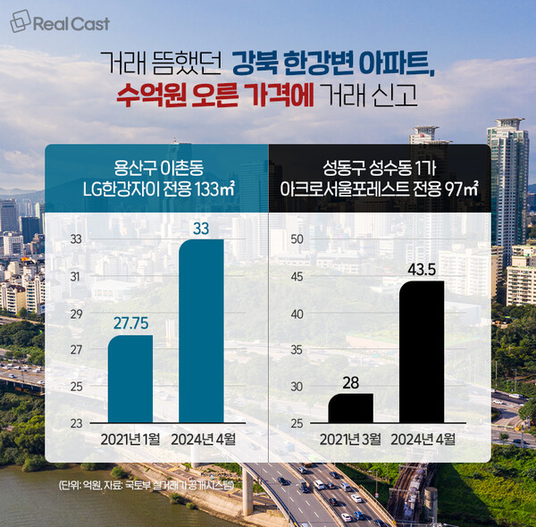 강남 외에도 남쪽으로 한강을 조망할 수 있는 강북 단지들도 신고가를 기록하고 있습니다. 용산구 이촌동 LG한강자이 전용 133㎡는 4월 33억원에 손 바뀜 됐습니다. 해당 타입의 직전 거래가는 2021년 1월 27억7,500만원이었는데요. 이보다 5억5,200만원 오른 겁니다.