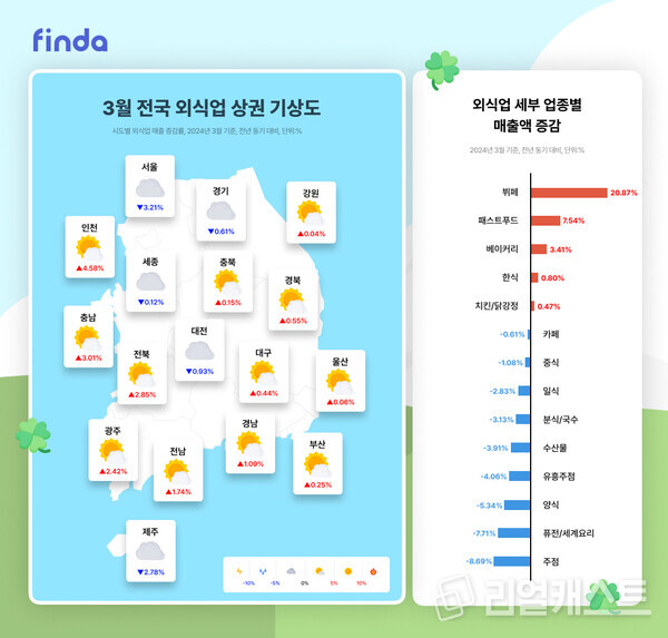 대출 전문 빅데이터 핀테크 기업 핀다(공동대표 이혜민·박홍민)가 상권 분석 플랫폼 ‘오픈업’을 통해 올해 3월 전국 외식업 상권 동향을 담은 ‘전국 외식업 상권 기상도’를 지난 9일 공개했다.