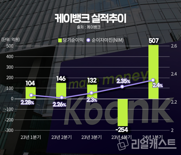 케이뱅크는 13일 2024년 1분기 실적을 발표했습니다. 올해 1분기 당기순이익은 507억 원을 기록하며 전년 동기(104억 원) 대비 약 5배가 증가한 것으로 확인됐습니다. 당기순이익 규모는 인뱅(인터넷전문은행) 1위 카카오뱅크(1분기 1112억 원)와 여신 규모 등으로 인해 아직까지 격차가 있는 상황이지만 케이뱅크가 1분기 당기순이익 증가율이 폭증한 만큼 향후 두 은행 간의 당기순이익 추이도 지켜볼 필요가 있겠습니다.