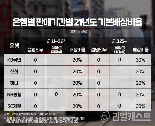 위의 사례와 같이 5개 은행별로 모든 투자자에게 적용되는 설명의무 위반사항과 개별 사례에서 확인된 적합성 원칙 및 부당권유 금지 위반사항을 종합해 기본배상비율을 산정했습니다.