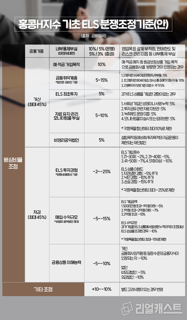 여기에 민원조사 등을 통해 확인된 사실관계를 바탕으로 각 사안별 ELS 분쟁조정기준에 제시한 예·적금 가입목적, 금융취약계층 해당 여부 등 가산 요인과 ELS 투자경험, 매입·수익규모 등 차감 요인을 구체적으로 적용해 최종 배상비율이 산정됩니다.