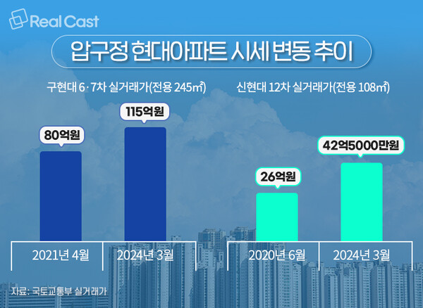 이밖에 구현대 6·7차 아파트 전용 245㎡도 최근 높은 거래가를 체결했습니다. 2021년의 직전 거래가(80억원) 대비 35억원 오른 115억원에 팔리면서 신고가를 갈아치웠습니다