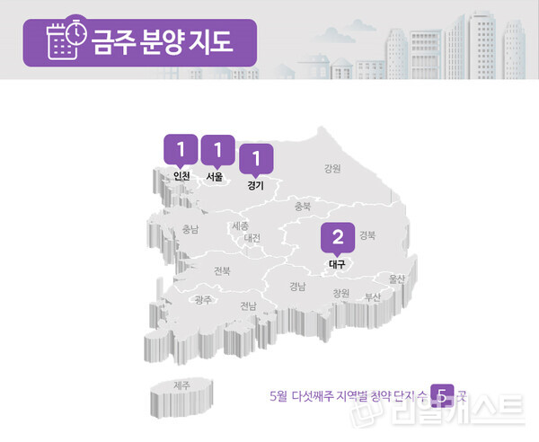 부동산인포에 따르면 5월 5주 전국에서 신규 청약 및 입주자를 모집하는 곳은 5곳, 총 3315가구로 집계됐습니다(총 가구수 기준).