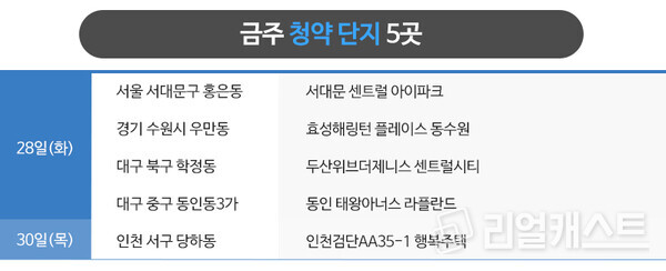 금주에는 부산 2곳, 경기, 경남 각 1곳씩 모델하우스 총 5곳이 오픈 할 예정입니다. 서울 물량은 주중 사이버모델하우스만 오픈 할 계획입니다.