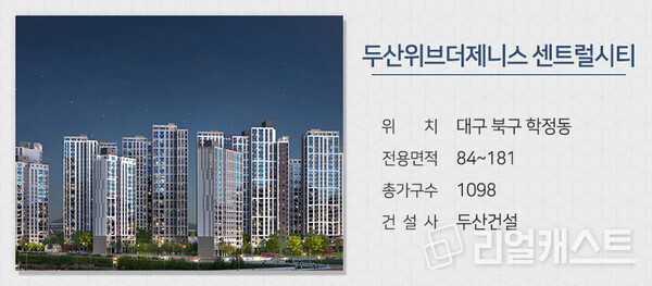 대구 북구 학정동에서는 두산건설이 ‘두산위브더제니스 센트럴시티’를 분양합니다. 대구지하철 3호선 학정역 역세권으로, 칠곡 경북대병원, 홈플러스, 강북경찰서 등 칠곡 일대 풍부한 인프라를 이용할 수 있습니다. 팔거천 수변공원이 가깝고 단지 북쪽으로도 공원이 조성돼 주거환경이 쾌적합니다.