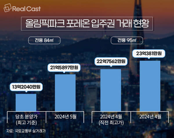 올림픽파크 포레온 전용 95㎡ 입주권도 지난 4월 23억381만원에 손바뀜 되며 최고가를 기록했습니다. 직전 거래가인 22억7562만원보다 3000만원 가까이 더 오른 것인데요.