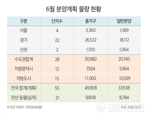 부동산시장 분석업체 부동산인포에 따르면 6월 중 전국에서 청약 및 모델하우스 오픈을 계획중인 곳은 55곳, 총 4만 9,908가구다. 이중 3만 7,638가구가 일반분양 분이다(민간아파트 기준). 지난해 6월 실적(9,808가구) 보다 약 5.1배 많은 수준이다.