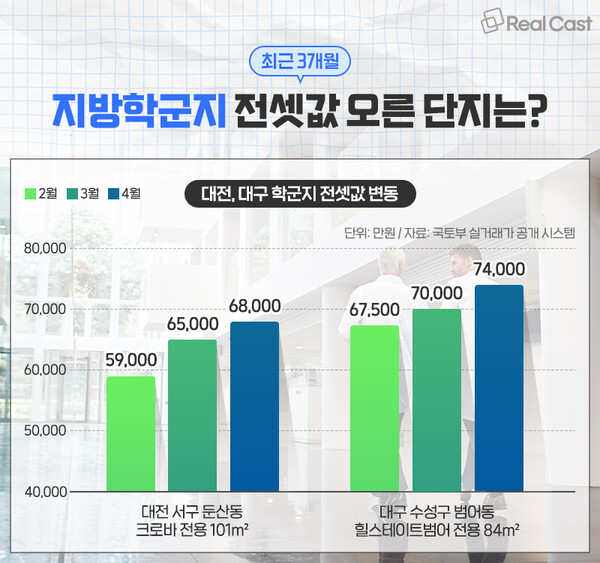 대구광역시 수성구는 전통의 명문 학군과 학원 350여 개가 모여 있는 곳입니다. 경신중·고와 가까운 ‘힐스테이트범어’ 전용 74㎡ 매매가가 2023년 5월 10억3,500만원이었는데요. 올해 2월 11억7,000만원에 거래되며 신고가를 경신했습니다. 같은 단지 전용 84㎡ 전셋값도 2월 6억7,500만원에서 3월 7억, 4월 7억4,000만원으로 오름세입니다.