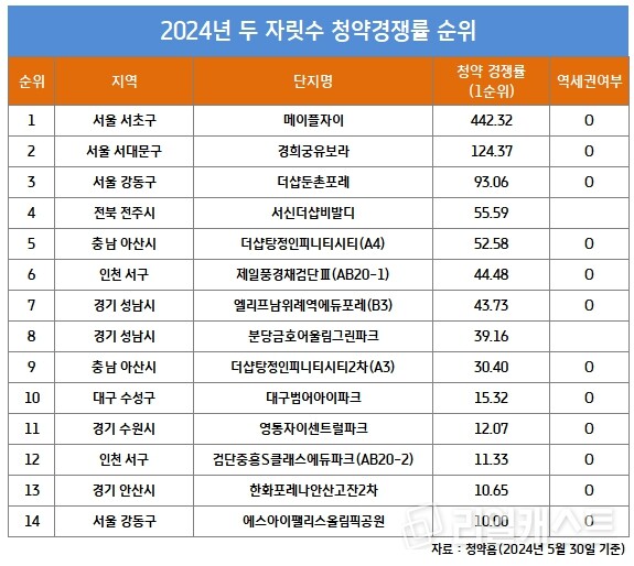 한국부동산원 청약홈에 따르면 올해 1월~5월(5월 30일)까지 전국에서 총 121개 단지가 분양에 나섰으며 5만931가구가 일반분양(특별공급 제외) 됐다. 이 중 경쟁률 1대 1 이상을 기록한 단지는 총 59곳이었으며 두 자릿수 경쟁률을 기록한 곳은 14곳으로 집계됐다.