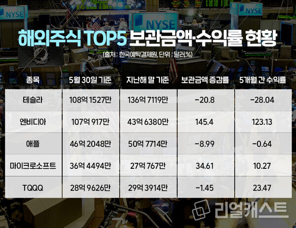 한 금융업계 관계자는 “시대 흐름에 맞춰서 회사가 움직이는지 아닌지에 따라 주가의 방향이 달라지는 사례를 어렵지 않게 찾아볼 수 있다”라며 “현재 우리나라 국민의 해외 보유주식 상위 5개 종목은 그 흐름의 최전선에 있는 주식으로 변동성이 심한 종목들이라 지속적인 성장을 이어갈 수 있을지 확인하며 투자에 나서는 것이 내 돈을 지키는 방법”이라고 언급했습니다.