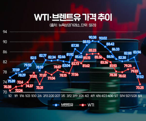 미국 현지시간 4일 뉴욕상업거래소에서 7월 인도 서부텍사스산 원유(WTI)는 전일 대비 0.97달러(1.31%) 하락한 배럴당 73.25달러에 거래를 마감했습니다. 이는 지난 2월 5일 이후 최저 수준을 기록했습니다.