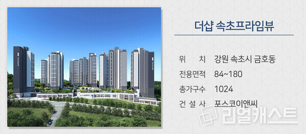 포스코이앤씨는 강원 속초시 금호동에 짓는 ‘더샵 속초프라임뷰’를 분양합니다. 영랑근린공원 조성 특례사업으로 들어서는 단지로 쾌적한 주거환경을 갖췄습니다. 영랑근린공원, 영랑호, 설악산, 영랑호CC, 동해바다 등 다양한 조망권도 장점입니다.