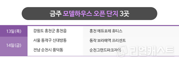 금주에는 모델하우스 총 3곳이 오픈 될 예정입니다. 서울 동작과 전남 순천, 강원 홍천 등입니다.