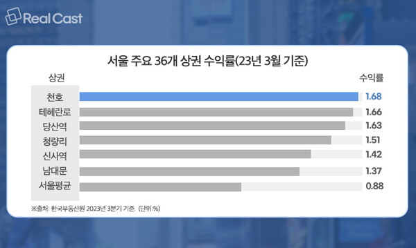 당시 천호 상권의 수익률은 1.68%을 기록해 서울지역 평균 수익률(0.88%) 보다 약 2배 가량 높은 것으로 나타났습니다. 천호 상권에 차순위는 테헤란로, 당산역, 청량리, 신사역 상권 등이 이름을 올렸습니다.