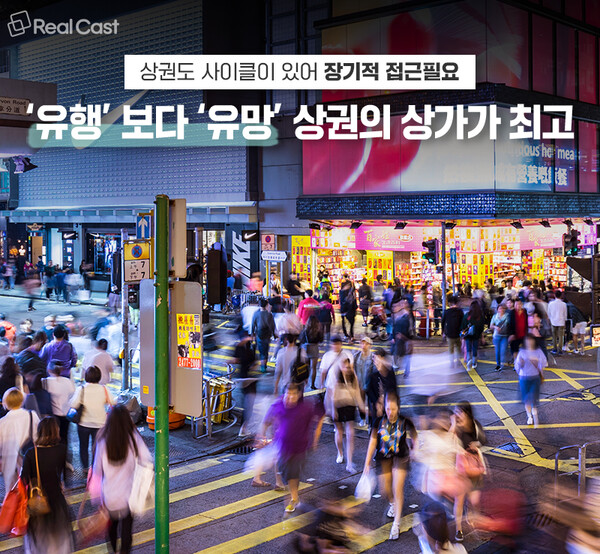 상권도 성장과 후퇴 같은 사이클이 있습니다. 때문에 상가 투자 역시 장기적인 투자 안목이 필요합니다. 정체돼 있기보다는 성장할 수 있는 상권이 좋습니다.