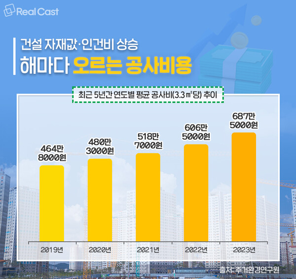 주거환경연구원의 연도별 평균 공사비(3.3㎡당)를 분석한 결과 ▲2018년 455만6000원 ▲2019년 464만8000원 ▲2020년 480만3000원 ▲2021년 518만7000원 ▲2022년 606만5000원 ▲2023년 687만5000원으로 조사됐습니다.