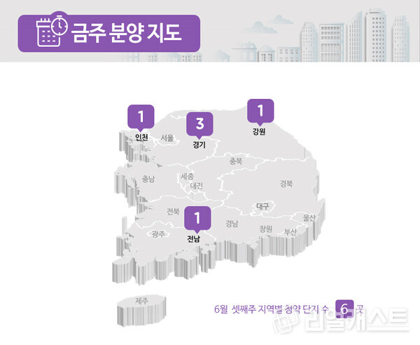 부동산인포에 따르면 6월 3주 전국에서 신규 청약 및 입주자를 모집하는 곳은 6곳, 총 2,325가구로 집계됐습니다(총 가구수 기준).
