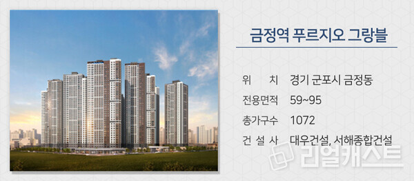 대우건설과 서해종합건설이 경기 군포시 당정동에 짓는 ‘금정역 푸르지오 그랑블’을 분양합니다. 지하철1호선과 4호선 환승역인 금정역을 이용할 수 있고, 추후 금정역엔 GTX-C노선이 연결될 예정입니다. 평촌신도시 학원가와 대형 상업시설 이용도 편리합니다.