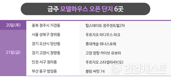 금주 모델하우스는 수도권 4곳, 지방 2곳 등 총 6곳이 오픈 될 예정입니다.