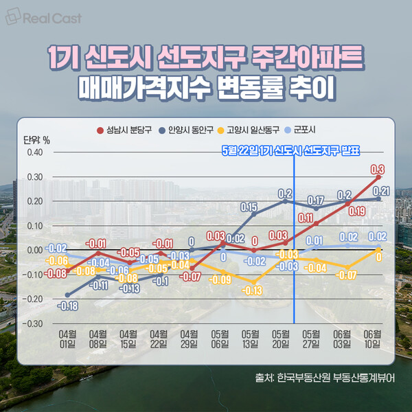 1기 신도시 선도지구 추진 일정이 발표되자, 해당 지역에서는 이미 집값이 들썩이는 모습입니다. 한국부동산원 부동산통계뷰어에 따르면, 경기 성남시 분당구는 4월까지 주간아파트 매매가격지수가 주로 마이너스를 기록했는데요. 1기 신도시 선도지구 선정계획 발표 직후인 5월 4주에는 0.11%, 6월 1주 0.19%, 6월 10일 0.30%로 점차 상승 폭을 늘렸습니다.