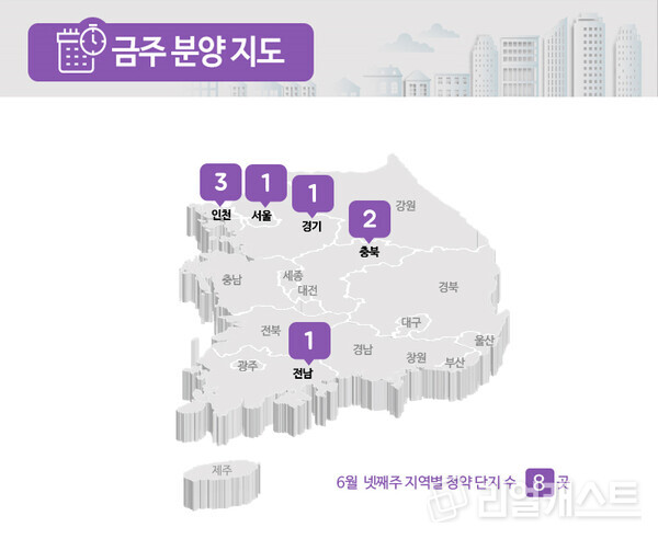 부동산인포에 따르면 6월 4주 전국에서 신규 청약 및 입주자를 모집하는 곳은 8곳, 총 4,691가구로 집계됐습니다(총 가구수 기준).