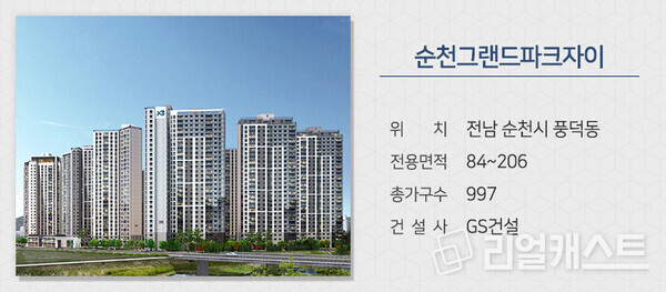 GS건설이 전남 순천에서 ‘순천그랜드파크자이’를 분양합니다. 차량으로 5분거리의 순천역에선 KTX, SRT를 이용할 수 있습니다. 순천만국가정원, 오천그린공장 등이 가깝고, 홈플러스, 이마트 등 편의시설도 걸어서 이용 가능합니다.