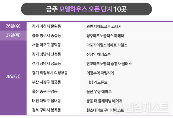 상반기 막판에 오픈 현장이 몰리면서 금주 모델하우스는 수도권과 지방에 각각 5곳씩 총 10개 단지의 모델하우스가 오픈 될 예정입니다.