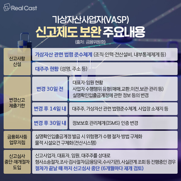 27일부터 암호화폐 거래소, 블록체인 지갑 등 가상자산사업자(VASP)의 신고사항이 대거 늘어납니다. 가상자산 관련 법령준수체계와 함께 대주주 현황도 신고해야 하고, 변경신고에도 기한을 설정하는 등 강화된 기준이 적용되게 됩니다.