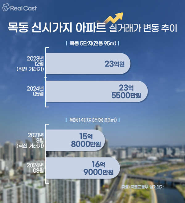 국토교통부 실거래가에 따르면 양천구 목동에 위치한 하이페리온2 전용 119.369㎡는 2020년 11월(18억8000만원)에 거래된 이후 3년 넘게 거래가 없다가 지난 3월 24억원에 거래되며 신고가를 기록했습니다. 목동신시가지4단지 전용 95.67㎡는 지난 6월 20억20억2000만원에 거래됐는데, 이는 지난해 직전 거래가(19억9000만원)보다 3000만원 가량 오른 금액입니다.
