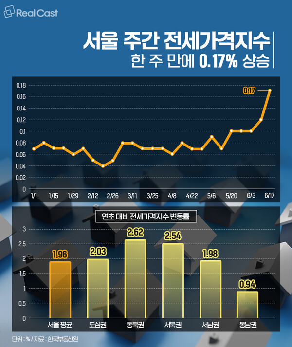 한국부동산원 주간아파트동향 자료에 따르면, 6월 17일 기준 서울 전세가격지수는 57주 연속 오른 것으로 나타났습니다. 전 주 대비 전국 평균 0.04% 오른 가운데, 서울은 0.17% 오른 것으로 나타났는데요. 이는 올 들어 가장 높은 수치입니다. 서울은 2023년 5월 15일 -0.06% 마이너스 변동률에서 5월 22일 0.01%로 상승세로 반전된 뒤, 2024년 6월 17일까지 총 57주, 1년 2개월 연속 상승세를 이어오고 있습니다.