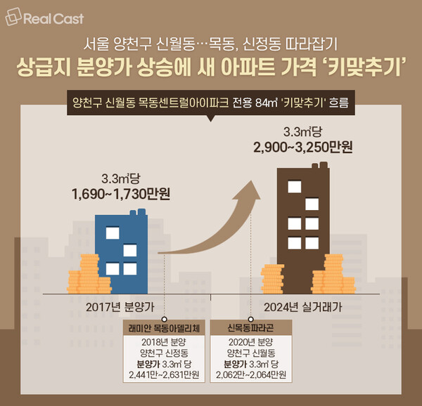 지난 2017년 신월동에서 분양한 목동센트럴아이파크 아파트는 전용 84㎡가 3.3㎡당 1,690만~1,730만원(5억6,700만~5억8,300만원)선에 분양됐습니다. 분양 당시 신월동인데 ‘목동’이라는 이름을 쓰고, 분양가도 비싸다는 곱지 않은 시선을 받기도 했습니다.