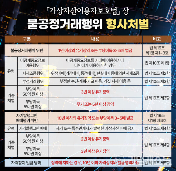 「가상자산이용자보호법」은 가상자산의 범위를 규정하고 사업자에게 각종 의무를 부과하는 한편, 불공정거래행위에 대한 형사처벌 및 과징금 부과 등의 제재 근거를 마련했습니다. 여기에 몇 가지 구체적인 사항을 시행령에 위임했습니다.