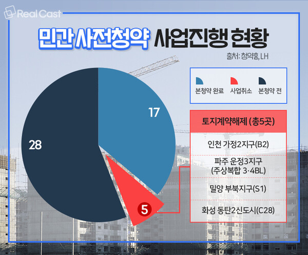 여기에 이번에 문제가 된 파주 운정3지구 3·4BL 이외에 해지 수순을 밟은 가정2지구 1필지, 밀양 부북지구 1필지, 동탄2신도시 1필지를 빼도 아직 23개 단지가 본청약에 이르지 못한 상황입니다.