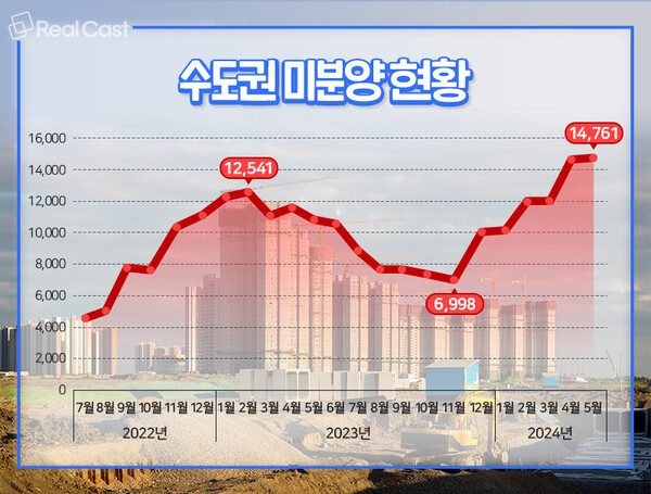 결국 미분양마저 늘고 있습니다. 국토부 자료에 따르면 올해 5월 수도권에는 총 1만 4,761가구의 미분양 물량이 쌓인 것으로 나타났습니다. 2017년 6월(15,235가구) 이래 최다 규모의 미분양 적체입니다.