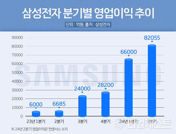 실제로 금융정보업체 에프앤가이드가 집계한 2분기 삼성전자 영업이익 전망치 컨센서스(평균치)는 8조 2055억 원으로 전년 동기(6685억 원) 대비 10배 이상 급증할 것으로 기대하고 있습니다.