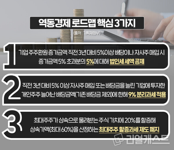역동경제 로드맵의 핵심은 크게 3가지입니다. 그중 먼저 평균 주주환원 금액을 직전 3년 대비 5% 이상을 배당이나 자사주 매입 등에 쓴 기업의 경우 증가 금액의 5%에 대해 법인세 세액 공제를 제공해 밸류업을 자발적으로 참여할 수 있도록 유도할 방침입니다.