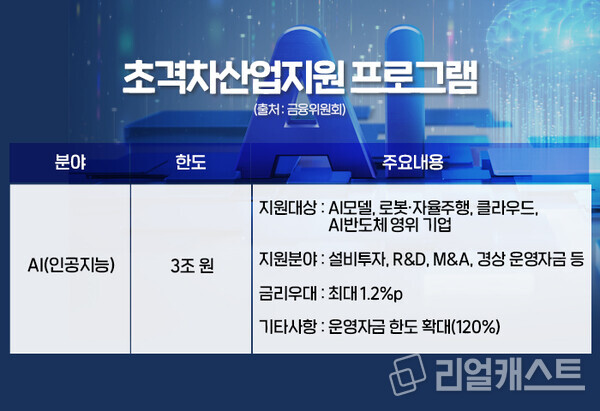 지난 분기부터 정책금융지원협의회 등을 통해 AI분야에 대한 정책금융 지원 필요성 등이 지속적으로 제기됐습니다. 또한 AI 경쟁력이 국가경쟁력의 핵심으로 떠오르자 이번 7차 정책금융지원협의회에서 AI 분야에 대한 총 3조 5000억 원 규모의 신규 자금공급지원방안이 결정됐습니다. 세계적인 추세에 따라 AI산업에 대한 자금수요 및 투자수요가 급격하게 증가하고 있는 점을 고려해 이번 자금공급지원방안이 추진하게 된 계기입니다.