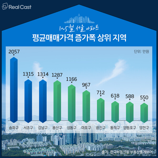 다만, 실제 아파트 평균매매가격 증가는 강남 3구 지역이 가장 높은 것으로 나타났습니다. 특히 송파구의 경우, 올해 1~5월간 아파트 평균매매가격 증가폭이 가장 컸는데요. 1월 16억1647만원에서 5월 16억3704만원으로 2057만원이 상승했습니다. 강남구와 서초구는 각각 1315, 1314만원이 올랐으며, 용산구(1287만원), 성동구(1166만원), 마포구(967만원) 순으로 나타났습니다.