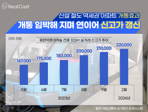 동탄역 바로 앞에 위치한 주상복합 아파트인 ‘동탄역 롯데캐슬’은 연이어 신고가를 기록 중입니다. 이 아파트 전용 102㎡는 올해 2월 22억원에 거래되며 종전 신고가(2023년 9월 21억)를 넘어섰습니다. 지난해 8월 처음으로 20억원을 넘어선 이후 6개월 사이에 2억원이 더 오른 셈입니다. 개통이 임박해 지면서 개통 프리미엄을 선점하려는 이들이 빠르게 매수에 나선 것입니다.