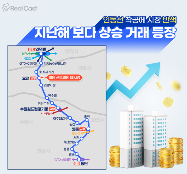 인동선 18개 역 가운데 급행 열차가 정차하는 5개 역(인덕원, 오전, 수원월드컵경기장, 영통, 동탄) 일대는 수요자들의 관심이 더해질 것으로 보입니다. 급행역 인근 아파트 가격이 높게 나타나고, 조정기에도 상대적으로 안정적이기 때문입니다.