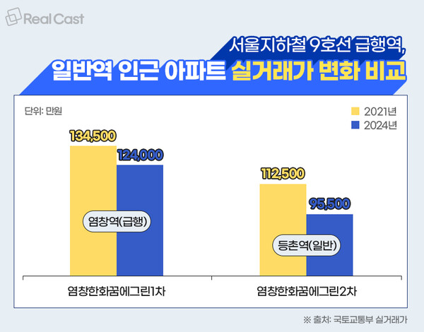 실제로 서울 강서구 염창동에 위치한 염창한화꿈에그린1차(2005년 준공), 염창한화꿈에그린2차(2006년 준공) 아파트는 각각 염창역(급행)과 등촌역 역세권 단지들로 올해 들어서 염창한화꿈에그린1차 전용 84㎡가 11억2,500만원, 염창한화꿈에그린2차가 9억5,500만원에 거래돼 2억8,500만원 차이를 보이고 있습니다.