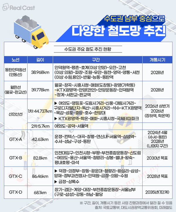 지난 4월 GTX-A 수서~동탄 구간 개통으로 수도권 내 진행중인 철도망에 관심이 높아지고 있습니다. GTX 이외에도 오는 2028년 전후 개통을 목표로 여러 철도노선이 추진되고 있습니다.