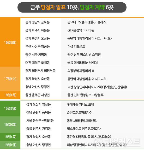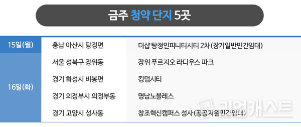 이외에도 예공종합건설이 경기 화성시 비봉면에서 ‘킹덤시티’, 명남종합건설이 경기 의정부시 의정부동에서 ‘명남노블레스’ 아파트를 분양할 예정입니다.
