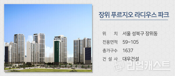 대우건설이 서울 성북구 장위동 장위뉴타운 6구역을 재개발해 짓는 ‘장위 푸르지오 라디우스 파크’를 분양합니다. 대단지 아파트로 서울지하철 1·6호선 환승역인 석계역 초역세권입니다. 선곡초, 광운초가 가깝고 이마트 월계점, 트레이더스 홀세일 클럽 월계점 등도 쉽게 이용할 수 있습니다.