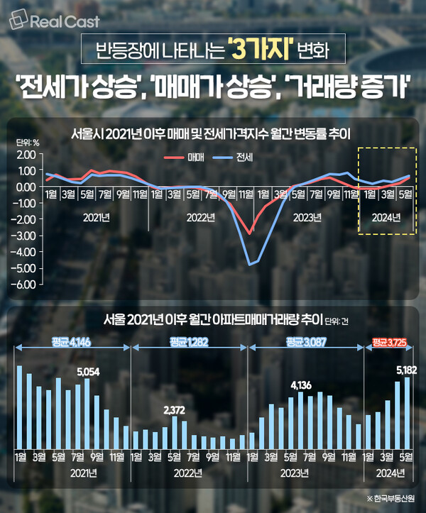 자연스럽게 아파트 매매거래도 늘고 있습니다. 한국부동산원에 따르면 지난 5월 서울 아파트 매매량은 5,182건으로 2021년 8월(5,054건) 이후 33개월 만에 5,000건을 넘어섰습니다.