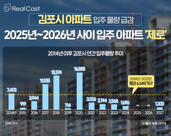 지난 10년(2014년~2023년)간 김포시에서 연평균 6,540가구가 입주한 것과 비교하면 매우 적은 수준임을 알 수 있습니다. 특히 오는 2025년과 2026년 사이에는 추가로 입주할 아파트가 없는 것으로 집계 돼 공급가뭄이 더욱 심화될 전망입니다.