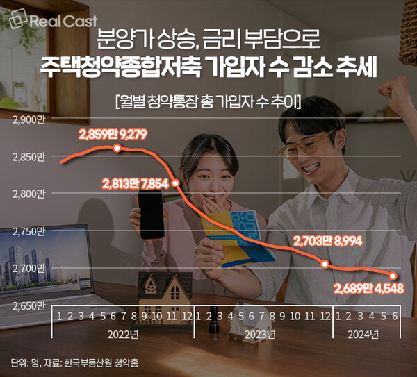만점 청약통장이 연이어 청약시장에 나타나는 것과 달리 청약통장 가입자 수는 점차 줄고 있는 것으로 나타났습니다. 청약홈에 따르면 6월 말 기준 전국 주택청약종합저축 가입자 수는 2,689만4,548명으로 전월(2,693만7,389명) 대비 4만2,841명 줄어든 것으로 조사됐습니다. 이는 2022년 6월 2,859만9,279명 이후 24개월째 감소하고 있는 것입니다.