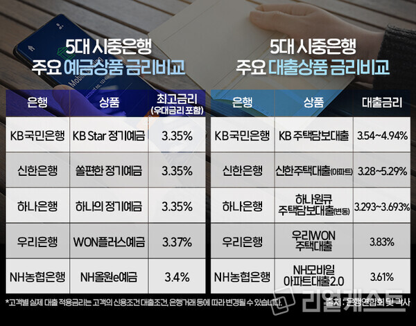 14일 은행연합회가 공시한 자료에 따르면 KB국민·신한·하나·우리·NH농협 5대 시중은행의 주요 예금상품(1년 만기) 최고금리는 평균 연 3.364%로 나타났습니다.