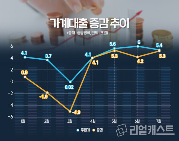 금융권 가계대출의 다수를 차지하고 있는 주택담보대출은 전월과 비교해 5조 4000억 원이 증가했습니다. 6월(5조 9000억 원)에 비해서는 소폭 줄어들었지만 여전히 많은 대출이 이어지고 있습니다.